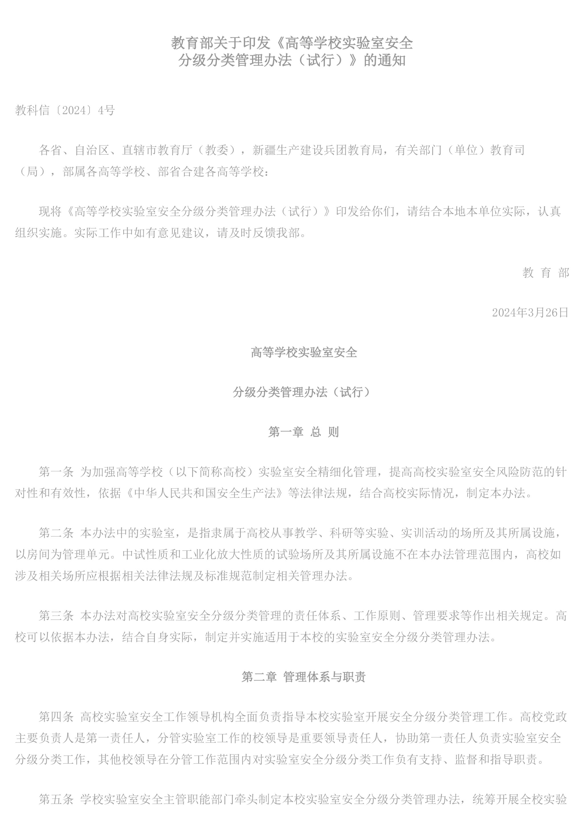 教育部关于印发《高等学校实验室安全分级分类管理办法(试行)》的通知