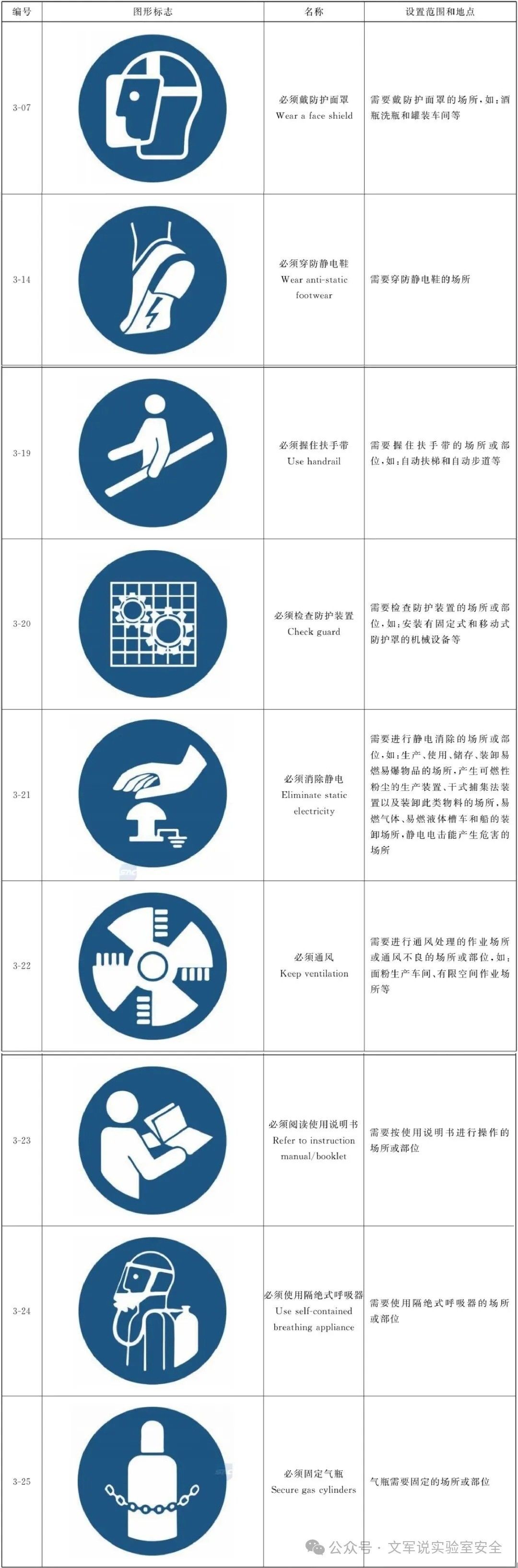 更改38个标志的英文名称:“当心爆炸”“当心腐蚀”“当心中毒”“当心生物危害”“当心触电”“当心碰头”“当心伤手”“当心夹手”“当心电离辐射”“当心激光”“当心非电离辐射”“当心叉车和其他场(厂)内机动车辆”“当心坠落”“当心绊倒”“禁止阻塞”“禁止乘人”“禁止倚靠”“禁止饮用”“禁止戴手套”“禁止穿带钉鞋”“必须戴防护眼镜”“必须戴遮光护目镜”“必须戴口罩”“必须戴防毒面具”“必须戴护耳器”“必须戴安全帽”“必须戴防护帽”“必须系安全带”“必须穿救生衣”“必须穿防护服”“必须戴防护手套”“必须穿防护鞋”“必须洗手”“必须加锁”“必须接地”“必须拔出插头”“安全出口”“应急避难场所”。