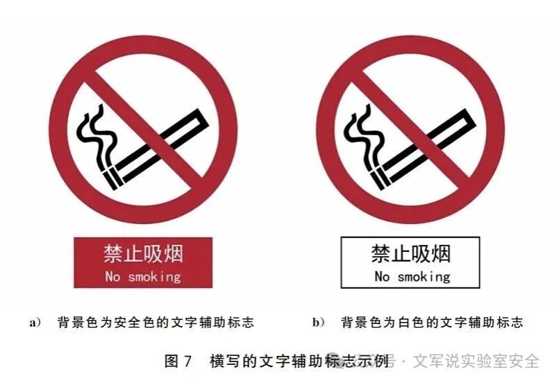 文字辅助标志不再区分横写与竖写,文字辅助标志可位于安全标志的上面、下面、左侧或右侧,显著程度不应超过相伴的安全标志。应使用标准名称作为辅助文字,背景色应为安全标志的安全色或白色。另外还对英文辅助文字做出了要求:英文辅助文字第一个单词的首字母应大写,其余单词字母均小写。