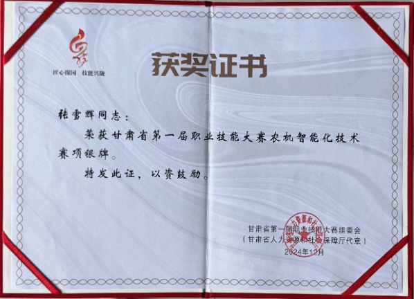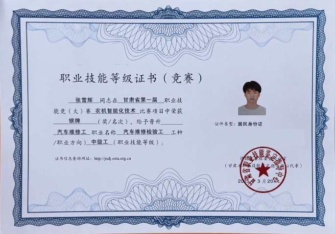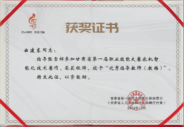 在曲建东老师的悉心指导下,学生杨鹏辉、张雪辉在赛场上沉着冷静、稳定发挥。杨鹏辉在重型车辆维修赛项中,凭借对车辆维修技术的熟练掌握和灵活运用,攻克重重难关;张雪辉在农机智能化技术赛项里,充分展现出对前沿技术的理解与操作能力。最终,二人分别在各自赛项中以第二名的成绩荣获银奖,同时还给予晋升汽车维修工的中级职业技能等级,为自己的技能水平增添了权威认证。此外,曲建东老师也因出色的指导工作,被评为优秀指导教师。