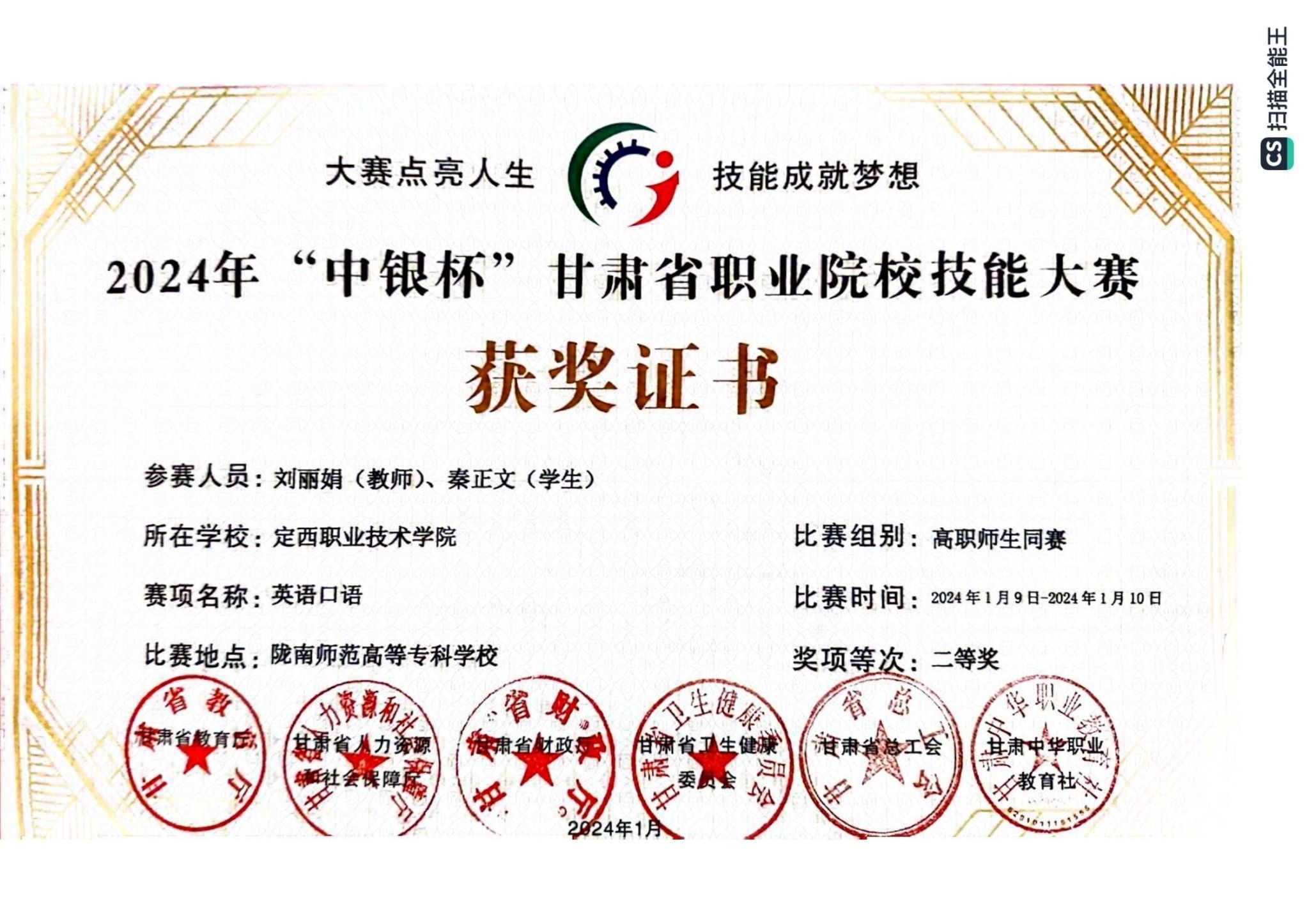 2024年“中银杯”甘肃省职业院校技能大赛“英语口语”赛项获奖证书