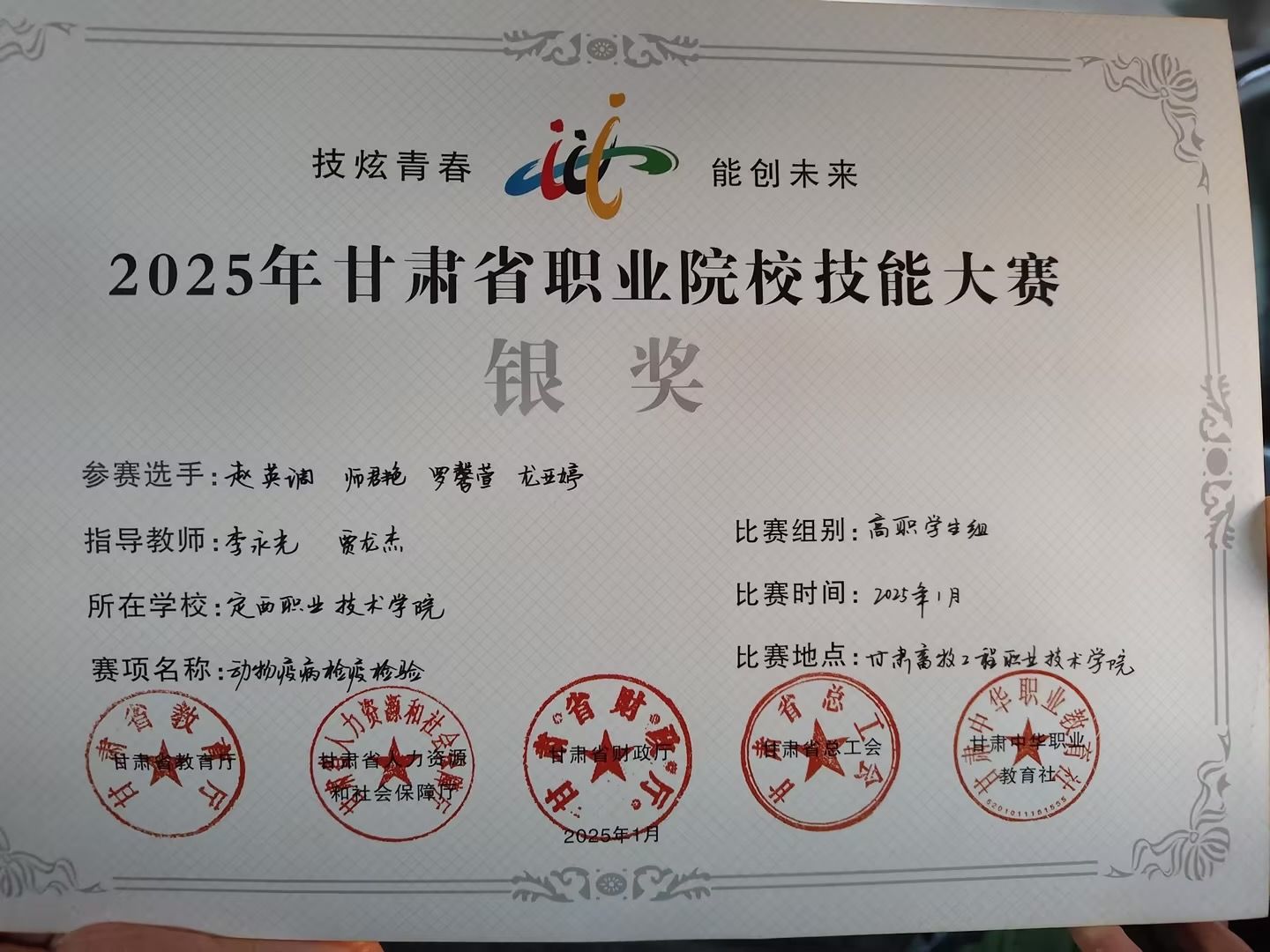 1月10日至1月13日,在2025年全省职业院校技能大赛中,bat365畜牧兽医专业龙亚婷、师君艳、赵英调、罗馨萱凭借出色的专业技能和稳定的发挥,荣获全省动物疫病检疫检验赛项(高职学生组)银奖的殊荣。这一成绩的取得,不仅是对bat365师生专业技能水平的肯定,更是对bat365教育教学质量的有力证明。