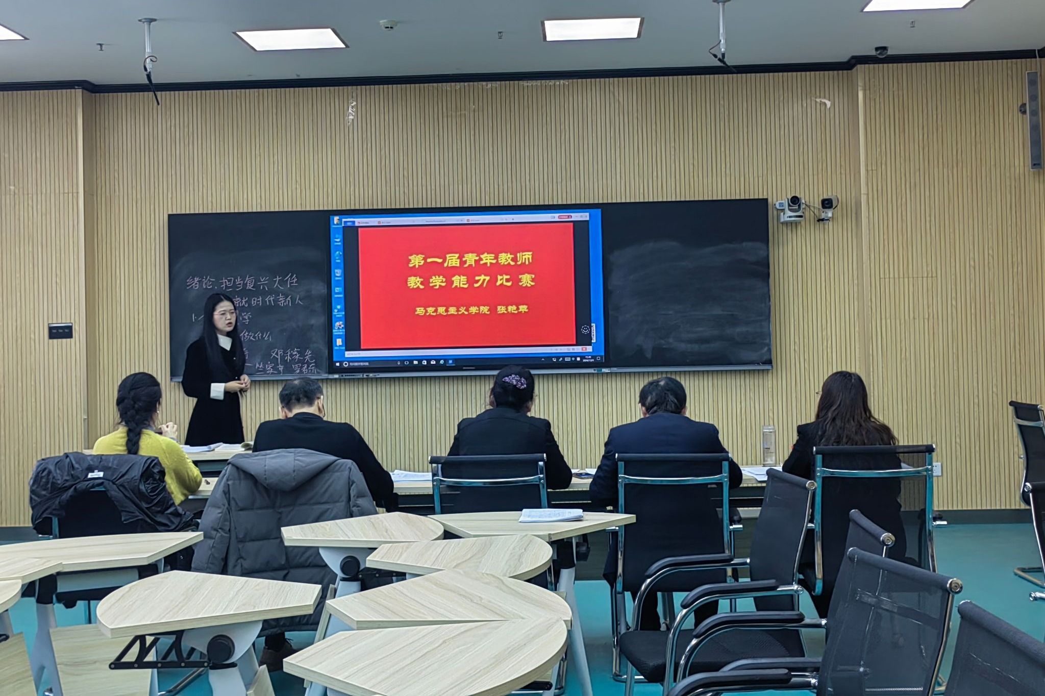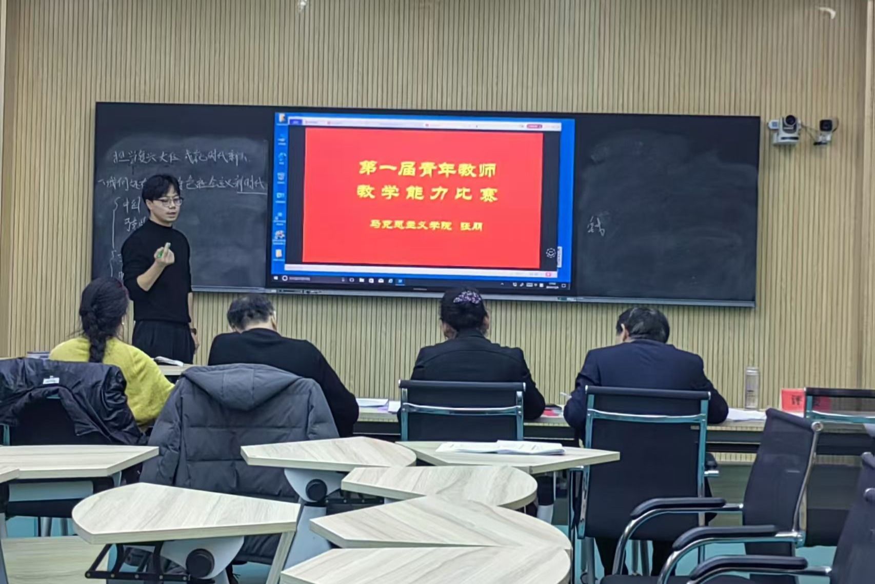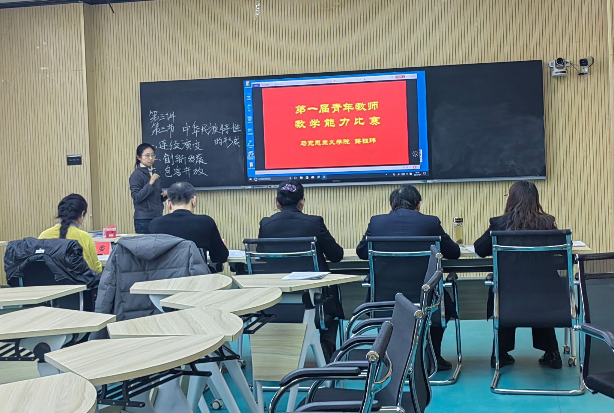 在教学比赛环节,参赛教师分别围绕《习近平新时代中国特色社会主义思想》《思想道德与法治》《中华民族共同体概论》《思政综合》的课程内容依次上台进行20分钟的教学展示。青年教师们精心准备,并在教学理念和教学方法上进行大胆创新,在有限的时间内展现了精彩纷呈的授课内容以及粉笔字等教学基本功。