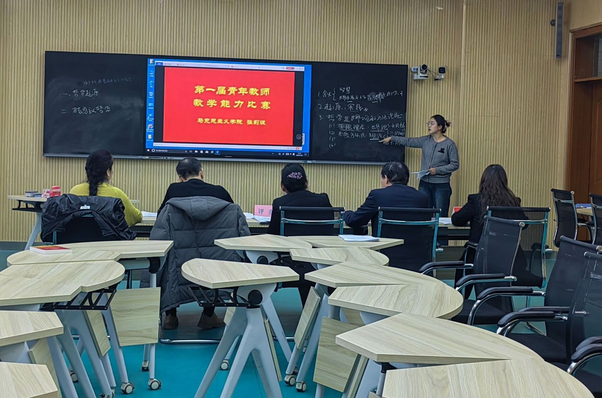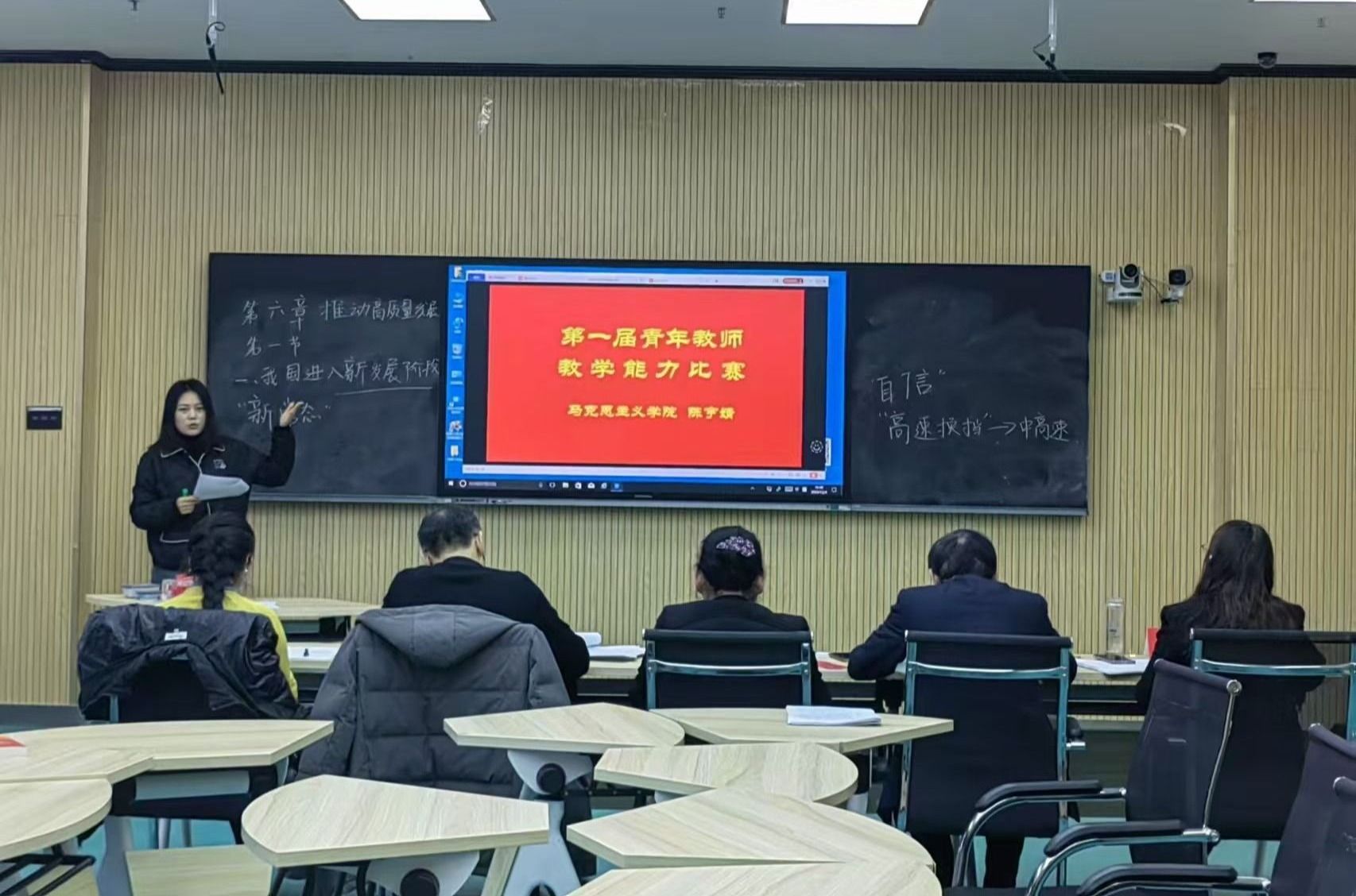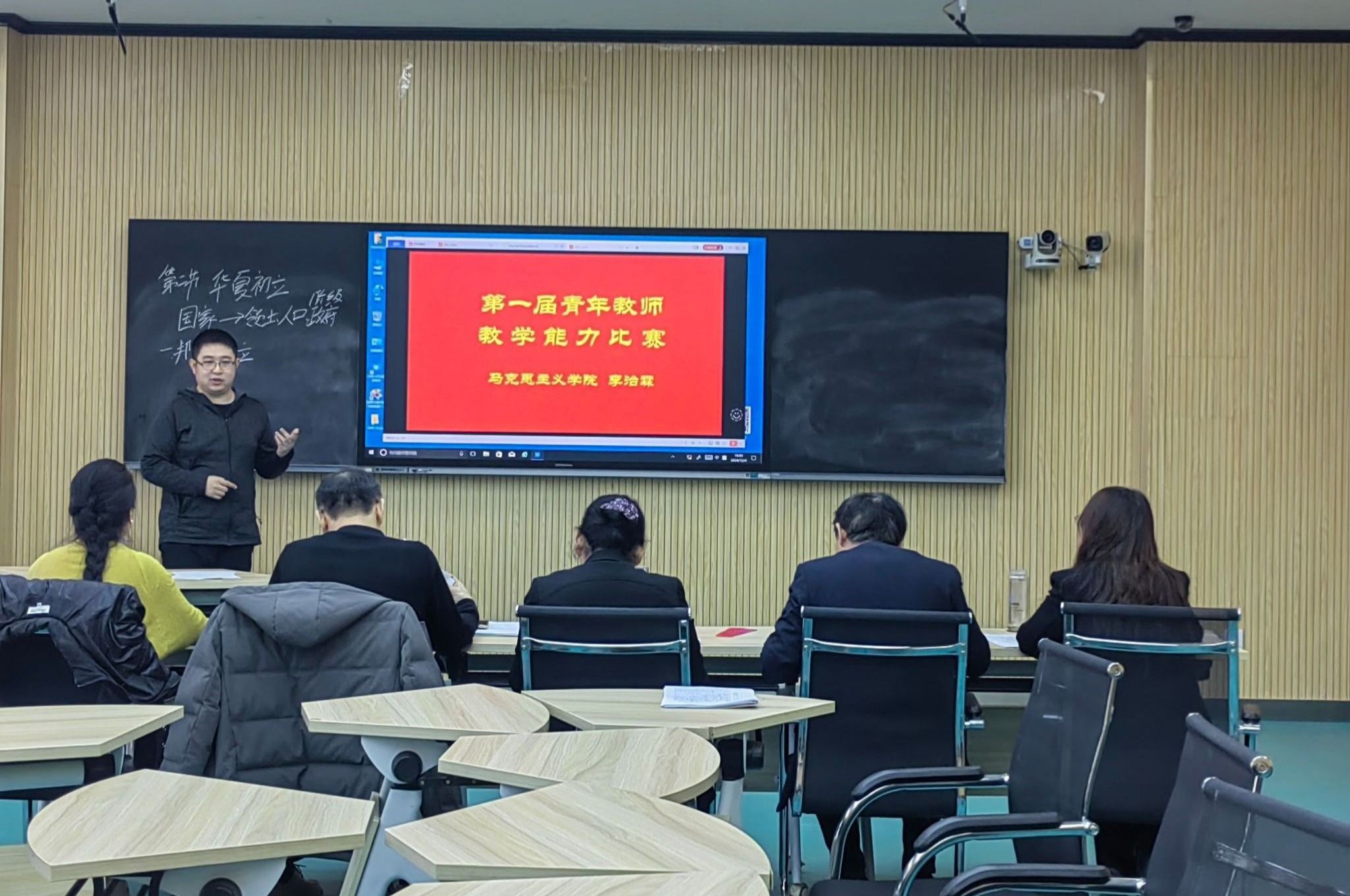 在教学比赛环节,参赛教师分别围绕《习近平新时代中国特色社会主义思想》《思想道德与法治》《中华民族共同体概论》《思政综合》的课程内容依次上台进行20分钟的教学展示。青年教师们精心准备,并在教学理念和教学方法上进行大胆创新,在有限的时间内展现了精彩纷呈的授课内容以及粉笔字等教学基本功。