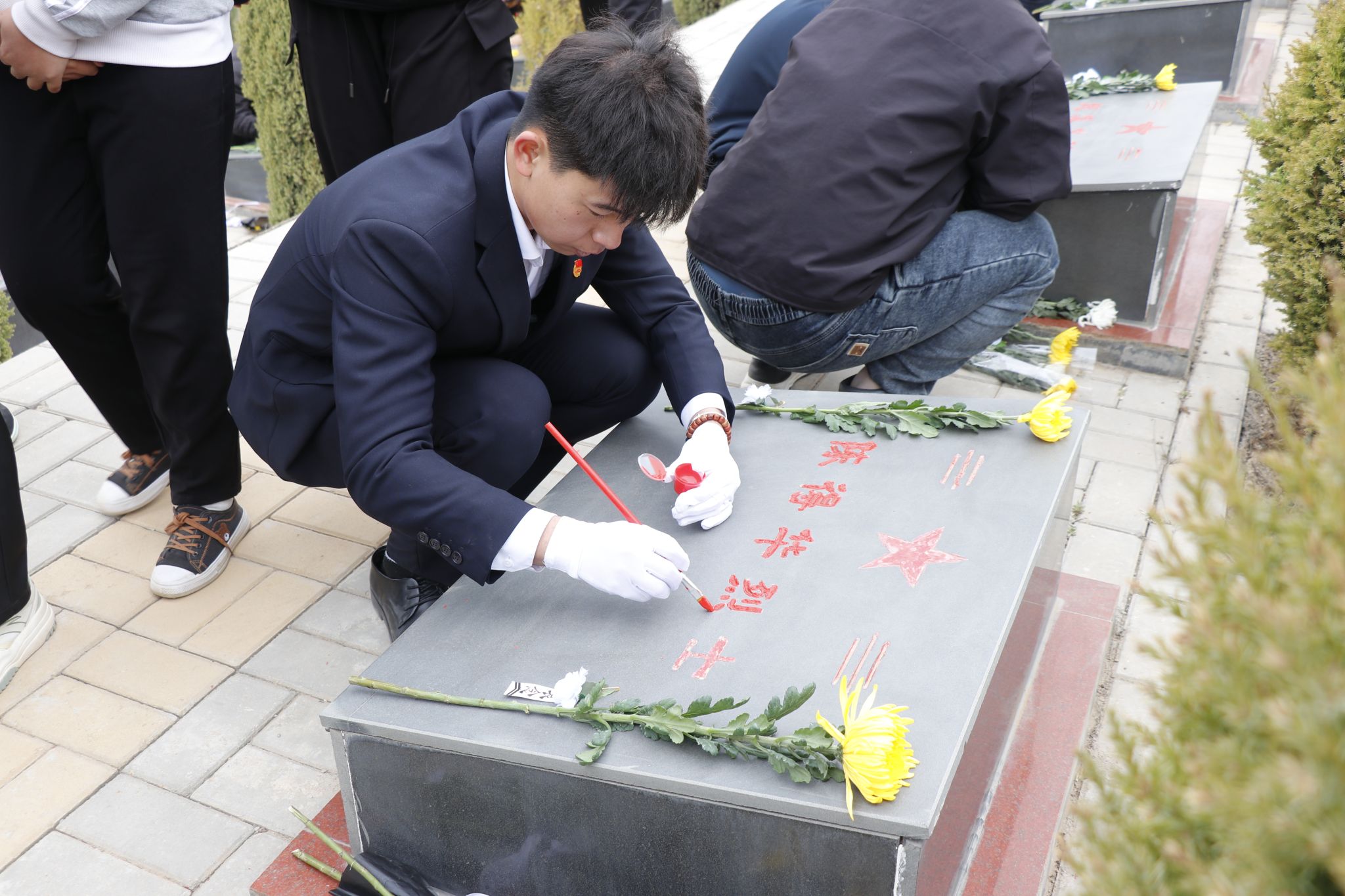 全体师生缓步至烈士墓碑前,仔细为烈士墓碑执笔描红、除尘理。当褪色的碑文被一笔一画勾勒出鲜红底色,英雄的名字在春日暖阳下熠熠生辉。通过这种特殊对话方式,革命精神深深镌刻在每位师生心中。