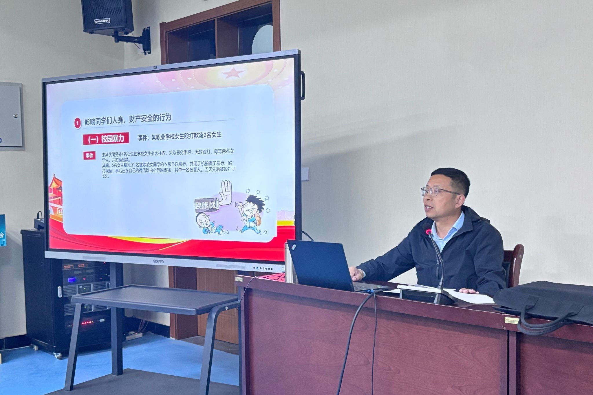 文育胜以视频、案例等形式,结合校园实际和学生特点,围绕校园欺凌、盗窃、抢劫、青少年不良行为、未成年人电信网络诈骗案等内容,详细剖析了未成年人违法犯罪的类型及后果,并向学生讲解了青少年如何远离犯罪,如何运用法律武器保护自身合法权益。
