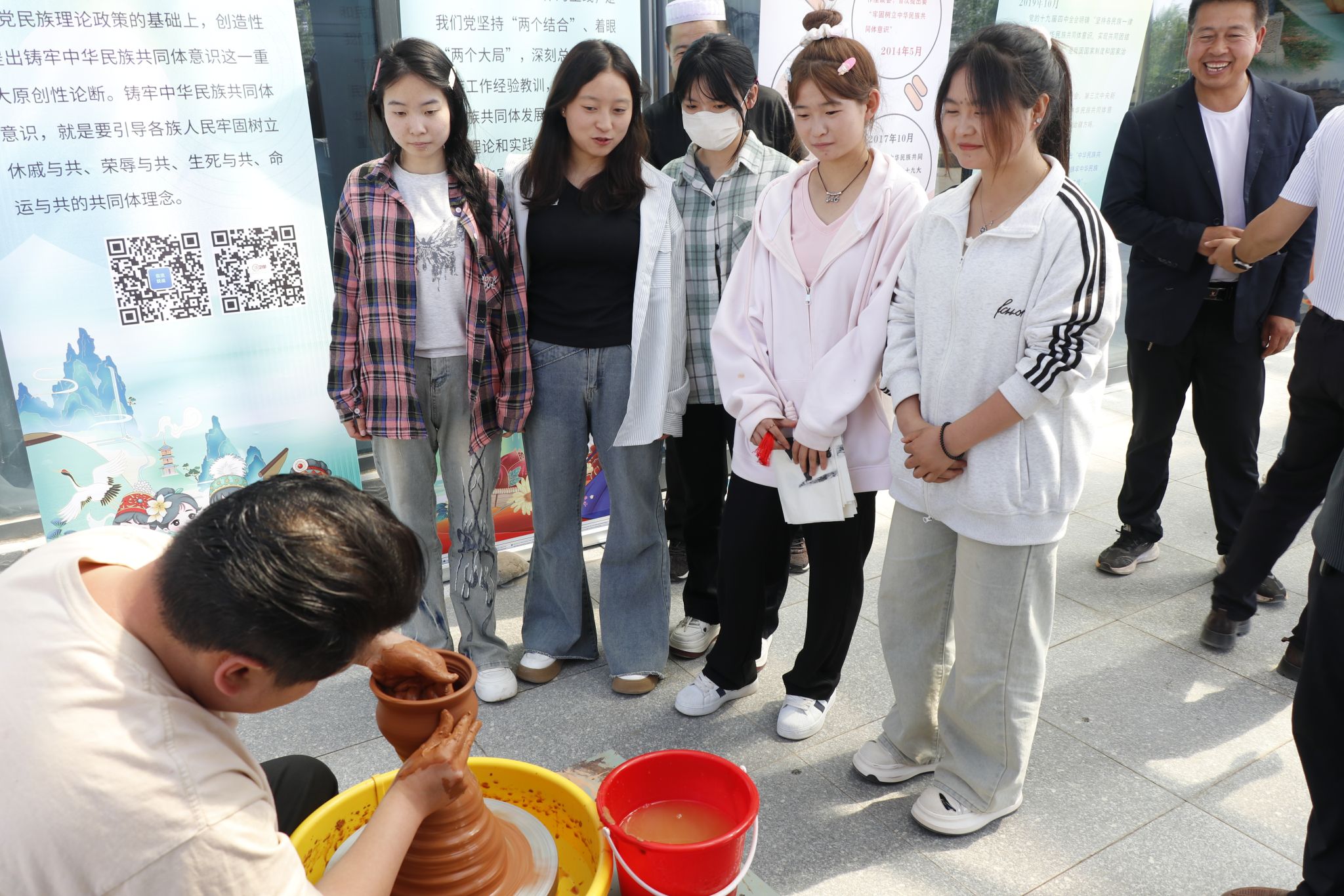 5月28 日上午,“夏祺端午 共促团结”主题活动在临洮县铸牢中华民族共同体意识教育基地隆重举行。活动现场,学生代表与书画艺术家、马家窑彩陶文化传人展开深度对话:书画艺术家以笔墨为媒,现场创作 “民族团结” 主题作品,勾勒各民族手足相亲的和美图景;彩陶文化传人则带领同学们触摸千年陶土技艺,从马家窑文化的纹饰线条中解读中华文明多元一体的历史密码。同学们在与非遗传承人的零距离交流中,不仅沉浸式体验了传统书画与彩陶艺术的魅力,更在文化根脉的追溯中深化了对中华文化统一性的认知,切实增强了文化自信与民族自豪感。