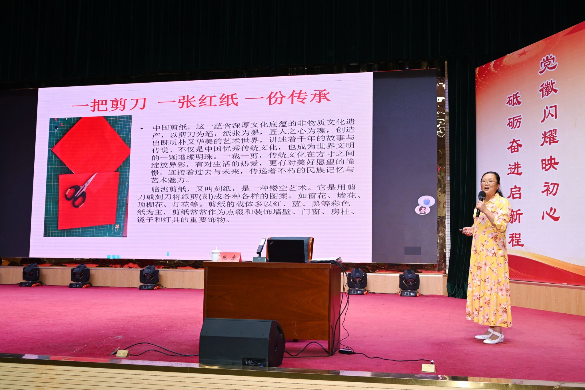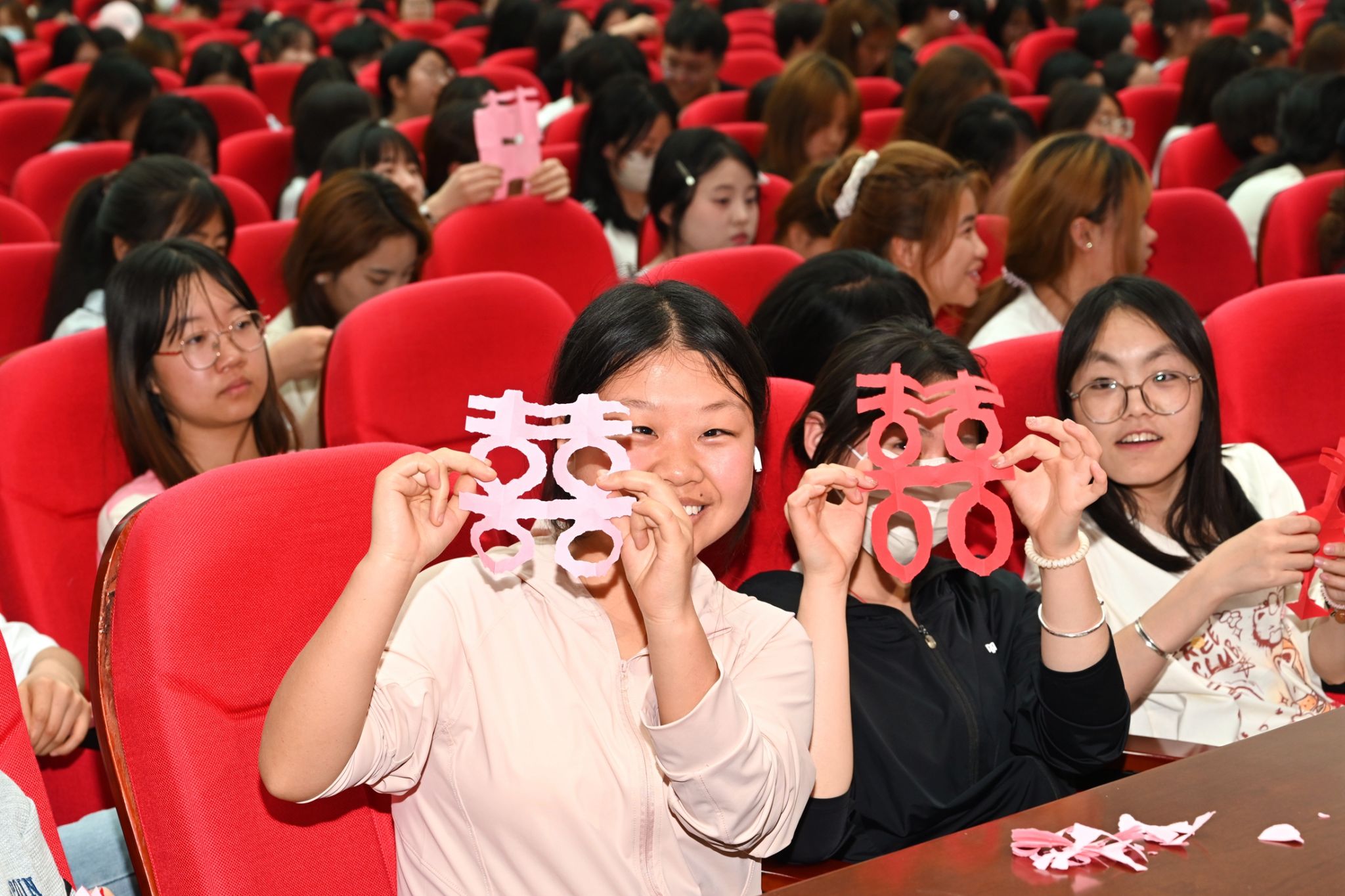 随后,毛艳红老师讲述了剪纸艺术的文化渊源、地方特色和个人艺术探索,更将宣讲现场变成了一个充满活力的互动课堂。毛老师手把手指导同学们体验“脱稿剪纸”的趣味,还向同学们赠送了亲手制作的精美剪纸作品。一时间,现场充满了欢声笑语和惊叹声,传统技艺的魅力在轻松愉快的氛围中深深感染了每一位参与者。