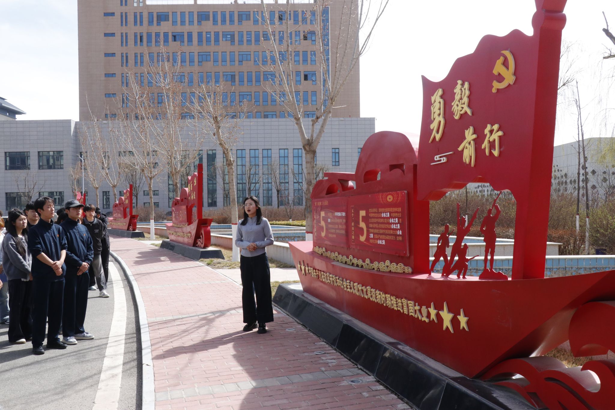 在党史文化长廊,马克思主义学院教师石桃娜以时间为脉络现场讲授思政课,沿着百年时光的轨迹,为大家讲述中国共产党从诞生到发展、从奋斗走向辉煌的壮阔征程,生动再现革命先辈不畏艰险、攻坚克难、无私奉献的峥嵘岁月。同学们驻足凝视展板、认真聆听讲解、仔细研读史料,深刻感悟中国共产党的初心使命与伟大建党精神,接受了一次触及心灵的思想洗礼和党性教育。