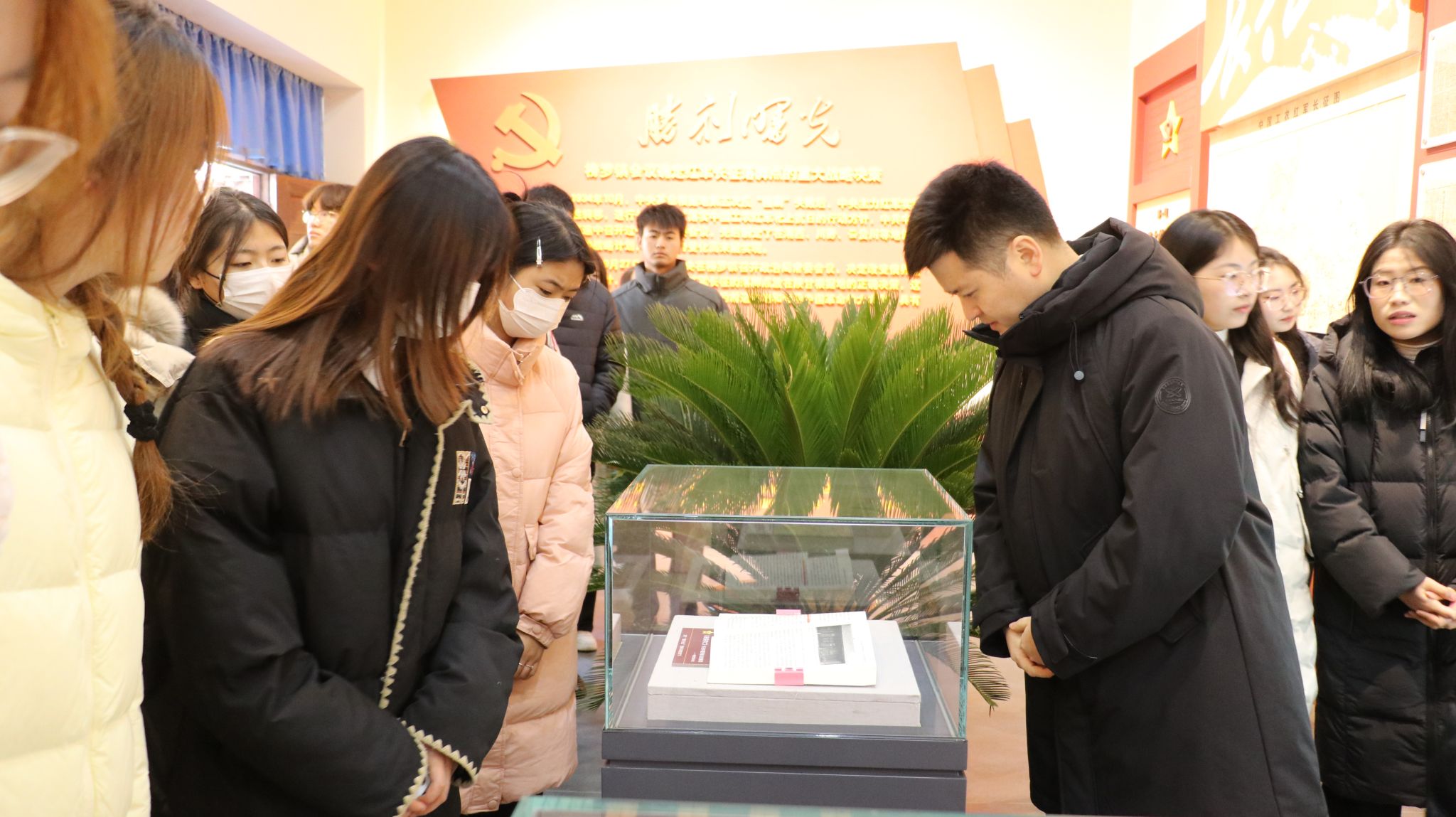 活动现场,“我志愿加入中国共产主义青年团……”在学员朱虹的领誓下,铿锵誓言响彻场馆上空,团员们紧握右拳,目光如炬,让入团初心在红色圣地重燃;随讲解员步入展陈馆,泛黄的文献、锈迹的枪械、还原的场景,将长征路上革命先辈的峥嵘岁月娓娓道来,众人驻足凝视,在历史的回响中感悟信仰力量;马克思主义学院院长许友强以馆为堂、以史为教材,将红色故事与理论精髓相融,让思政课在现场教学中焕发光彩;学员代表分享感悟时,字句间满是思想的升华与担当的觉醒;最后,全体人员齐声朗诵《七律·长征》,激昂的语调穿越时空,与革命先辈的壮志豪情共振。