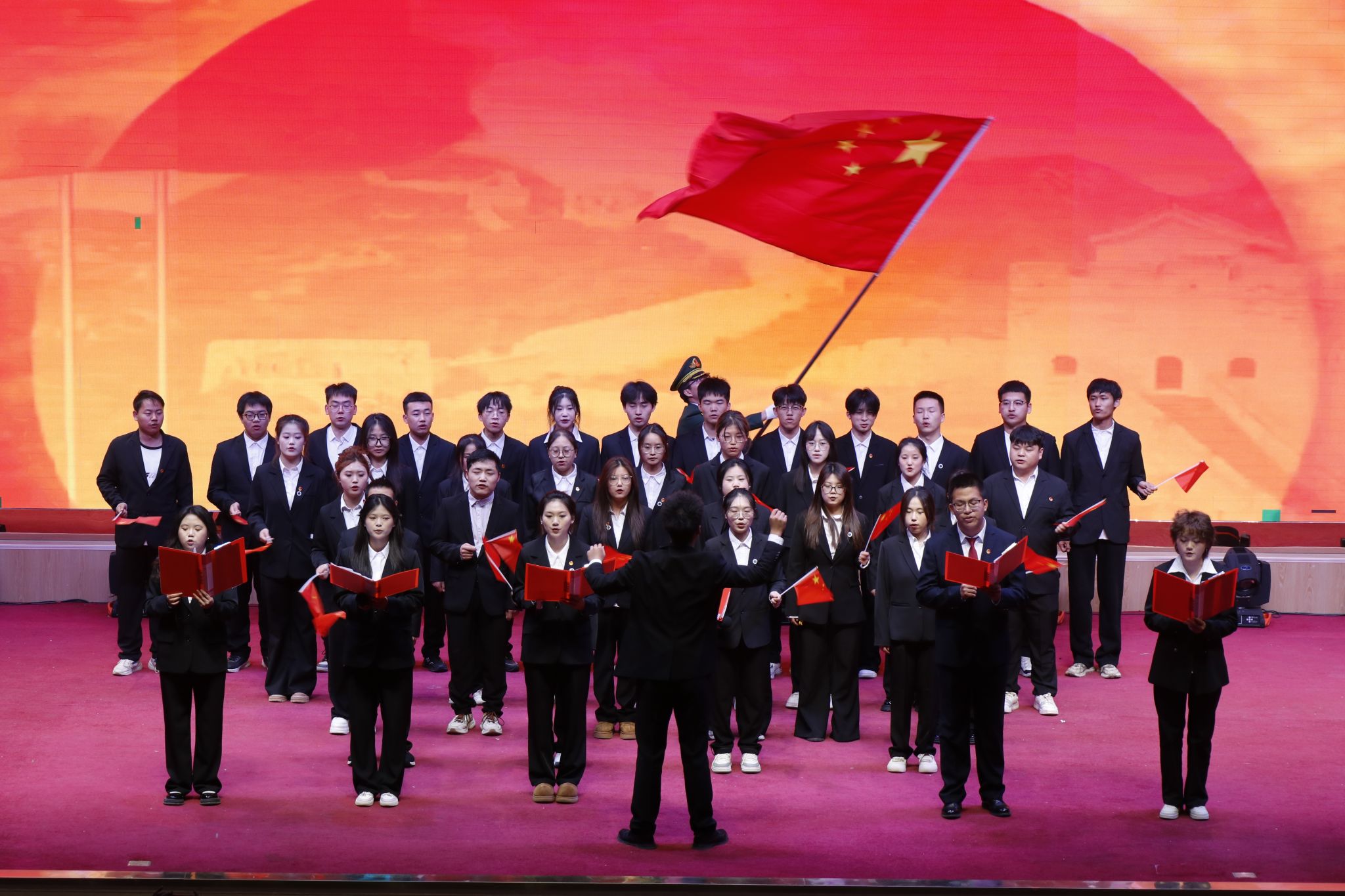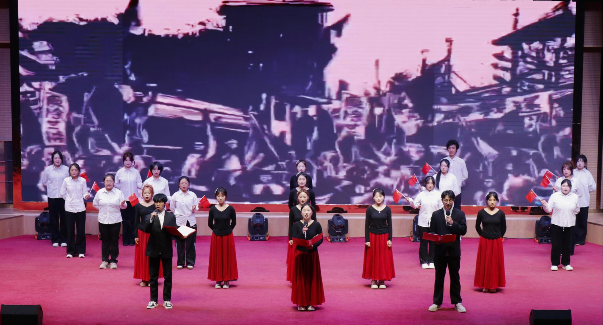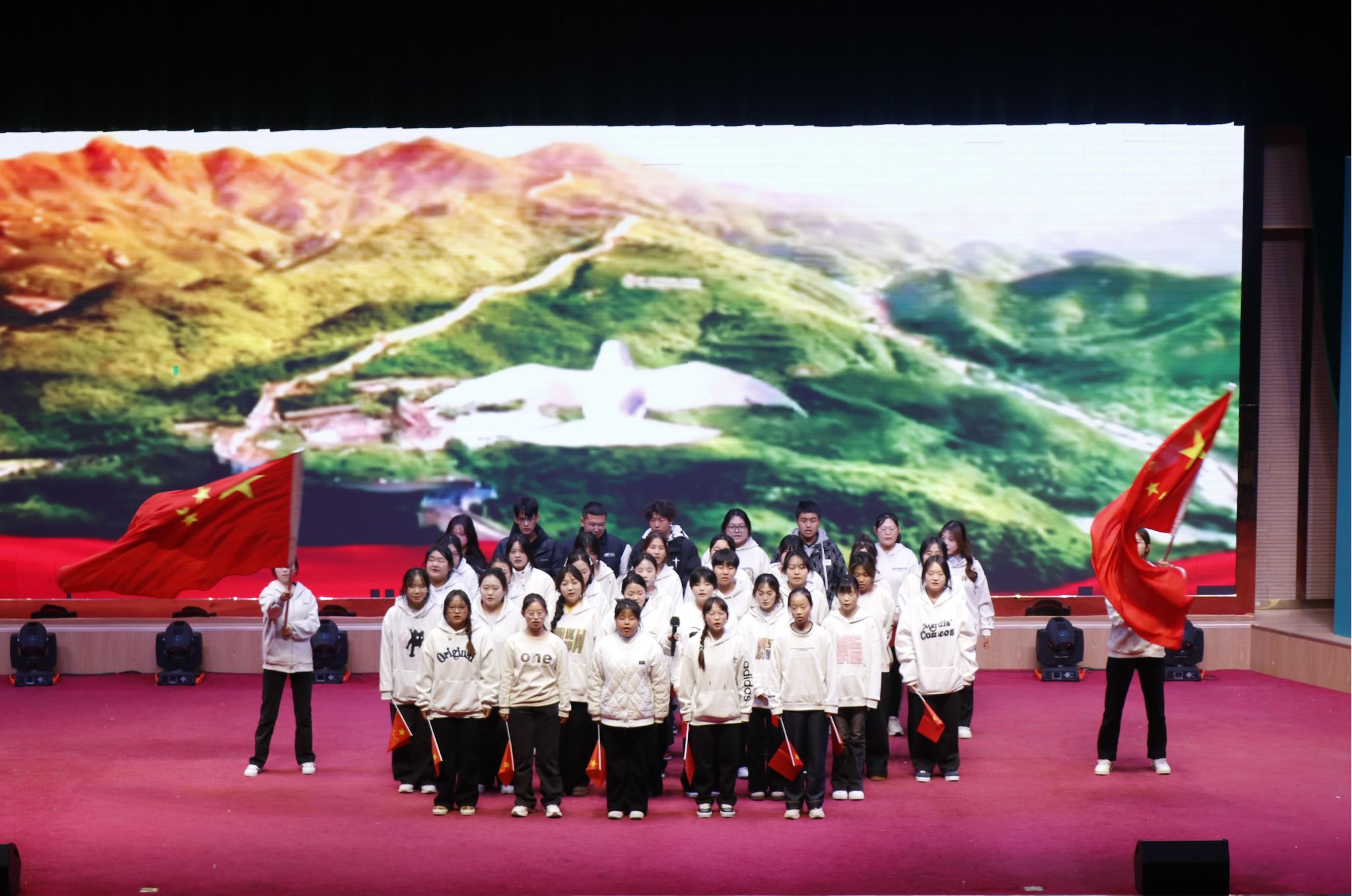 在“万疆颂歌”终章,中医康复241班带来的综合表演《燃青春之志,护华夏万疆》气势磅礴,彰显了青年学子守护山河的壮志豪情。最后,营养251班以一曲《我爱你中国》深情压轴,全体演职人员登台齐唱,歌声激昂,情感真挚,为整场展演画上圆满句号。
