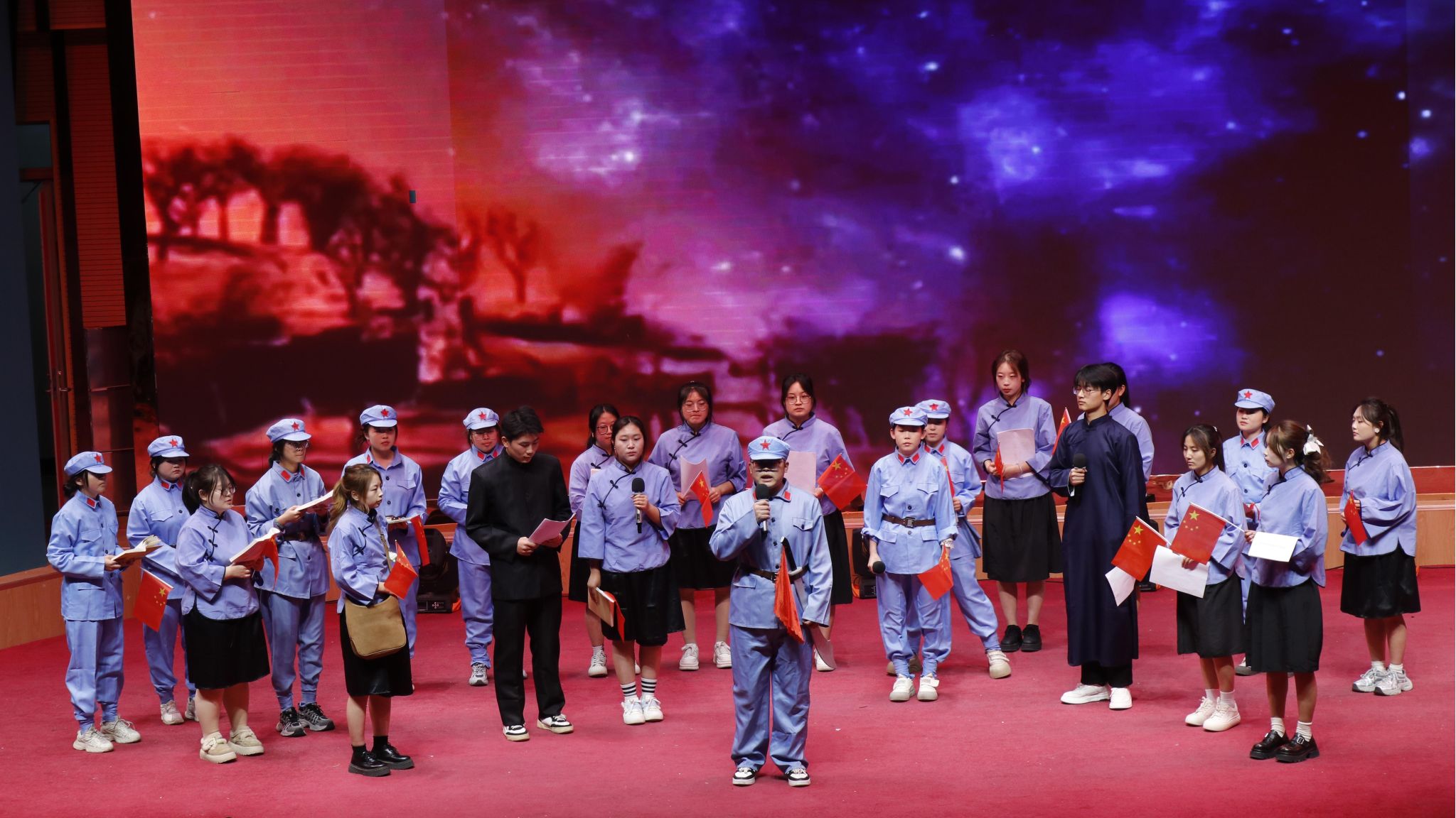 展演在序章“光的召唤”中拉开帷幕。动科241班带来的情境诗朗诵《这束光》,以饱含深情的演绎,将观众带回到延安窑洞的灯火旁,重温信仰之光照亮民族前途的历史时刻。随后,演出围绕“热血丰碑”“耕耘家园”“青春告白”“万疆颂歌”四大篇章徐徐展开,完整呈现了从革命抗争到家园建设,再到青春担当的精神传承谱系。