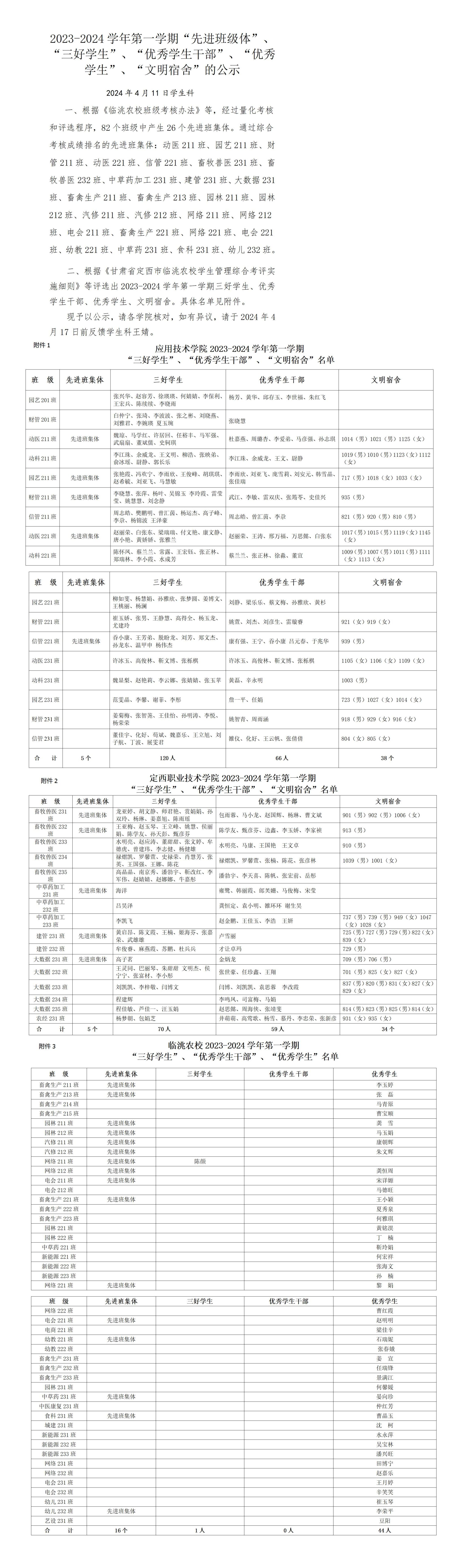 2023-2024学年第一学期“先进班级体”“三好学生”“优秀学生干部”“优秀学生”“文明宿舍”的公示