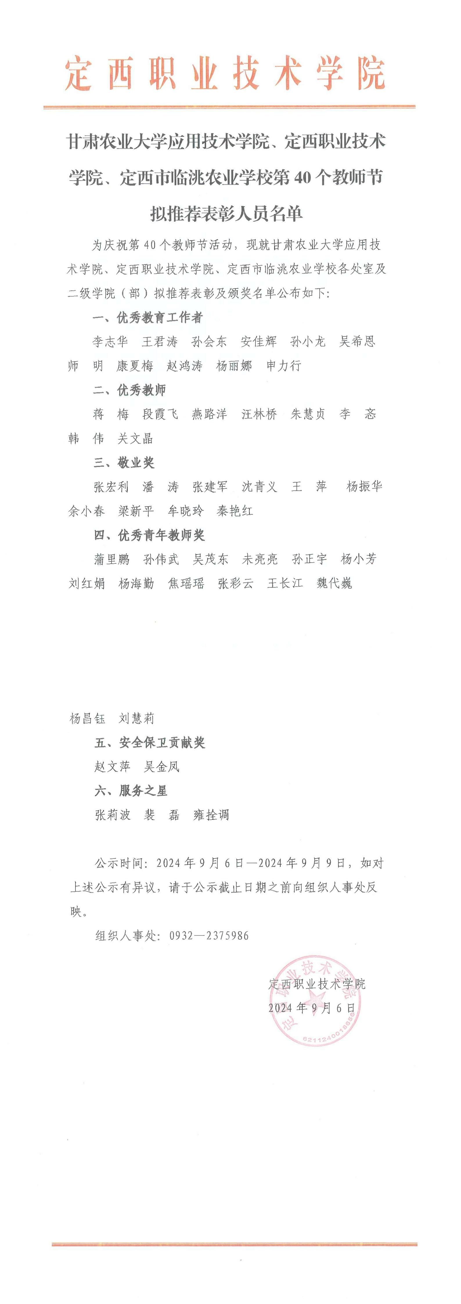 关于甘肃农业大学应用技术学院、bat365正版唯一官网、定西市临洮农业学校第40个教师节拟推荐表彰人员名单的公示